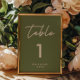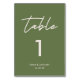 Une carte simple et élégante de numéro de table verte d'olive. Customisez avec vos noms et la date du mariage en bas.
