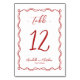 Mignonne Main tiré Quirky Red Whimsical Mariage Numéro de table. Cette carte de numéro de table est dotée d'une charmante bordure tourbée et en boucle dessinée à la main, ajoutant une touche ludique mais raffinée à votre événement. Le cadre fantaisiste entoure doucement le numéro de table, en utilisant un mélange de script et de polices de style manuscrites pour créer un design élégant et personnel inspiré de l'esthétique italienne. Les polices et les oeuvres d'art sont rouges, associées à un arrière - plan blanc simple pour un look propre et élégant. Parfait pour les mariages, les douches nuptiales, les fêtes de thé, les dîners de répétition, etc., ce design apporte une ambiance sophistiquée mais amusante, légère. Entièrement personnalisable, c’est une excellente façon d’ajouter une touche unique et élégante à votre célébration tout en gardant les choses joueuses et chic. Idéal pour les couples qui recherchent un design tendance et sobre qui complète leur journée spéciale.