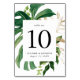 Elégante carte de numéro de table tropicale avec le numéro de table et vos détails mariages encadrés par une bordure de feuilles tropicaux aquarelles dans les tons verts complétés par le feuillage doré. Personnalisez en ajoutant vos noms et votre date de mariage. La conception se répète au dos de la carte. Conçu pour coordonner avec notre collection Tropical Gold mariage.