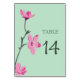 Cette carte de numéro de table est prête à être customisée avec votre numéro. C'est vert menthe avec un graphique en fleurs de cerisiers roses. La conception et le numéro sont imprimés de chaque côté.