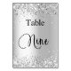 Le numéro de table est écrit avec un style manuscrit élégant. Lettres noires, fond blanc sur le devant et fond argent faux avec fausse poussière de paillettes, scintille sur le dos.