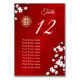 Cette carte de numéro de table de mariage chinois présente de jolies fleurs de cerisiers blancs et un symbole de bonheur double or sur un arrière - plan rouge rubis chatoyant. Avec des zones de texte pour ajouter une liste de noms d'invités.
