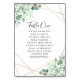 Noms modernes Verdure Eucalyptus Mariage géométrique Numéro de table. Doté de feuilles d'eucalyptus aquarelle et d'un cadre géométrique doré.