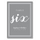 Ce design a été créé pour des célébrations mariages intimes plus petites. Simple, minimaliste et élégant Numéro de table de mariage SIX design contemporain avec une bordure double en blanc immaculé sur un arrière - plan gris ultime tendance. Le design est chic et intemporel. Personnalisez la conception de table mariage avec vos détails mariages en lettres et en script blancs. Le dos de la carte est un double de l'avant. Commandez-en une pour chaque table avec les numéros de table individuels. Les tables ONE à TEN sont conçues individuellement et sont disponibles dans notre magasin InvitationSuites sur Zazzle. Bien qu'il soit spécialement conçu pour un lieu plus petit, si vous avez besoin de numéros supplémentaires, envoyez-nous un courriel à InvitationSuites@gmail.com .