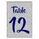 Une élégante carte de table mariage monogramme avec des chiffres bleus royaux sur un effet arrière - plan parties scintillant argent. Le style, la couleur et le placement de la police peuvent également être changés comme vous le souhaitez.