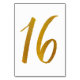 Tableau Numéro 16 : Cette carte de numéro de table de script de brosse décontracté est définie dans un faux papier doré. IMPORTANT : L'apparence du papier peint est un effet imprimé. Ce n'est pas un vrai papier d'aluminium. Si vous ne voulez pas cet effet, vous pouvez le supprimer comme ceci : 1) Cliquez sur "Customiser plus loin. 2) Trouvez l'image qui dit feuille z-or et supprimez-la. Choisissez ensuite votre propre couleur dans les couleurs arrière - plans.