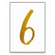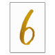 Tableau Numéro 6 : Cette carte de numéro de table de script de brosse décontracté est définie dans un faux papier doré. IMPORTANT : L'apparence du papier peint est un effet imprimé. Ce n'est pas un vrai papier d'aluminium. Si vous ne voulez pas cet effet, vous pouvez le supprimer comme ceci : 1) Cliquez sur "Customiser plus loin. 2) Trouvez l'image qui dit feuille z-or et supprimez-la. Choisissez ensuite votre propre couleur dans les couleurs arrière - plans.