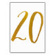Tableau Numéro 20 : Cette carte de numéro de table de script de brosse décontracté est définie dans un faux papier doré. IMPORTANT : L'apparence du papier peint est un effet imprimé. Ce n'est pas un vrai papier d'aluminium. Si vous ne voulez pas cet effet, vous pouvez le supprimer comme ceci : 1) Cliquez sur "Customiser plus loin. 2) Trouvez l'image qui dit feuille z-or et supprimez-la. Choisissez ensuite votre propre couleur dans les couleurs arrière - plans.