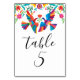 Numéros de table colorés et vibrants, avec des oiseaux d'inspiration mexicaine et un thème floral.