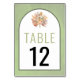Feuilles de palmiers séchés tropicaux, pampas herbe et fleurs de protéa sauge arche verte numéro de table mariage. Ce joli design mariage dispose d'un cadre en arc sur arrière - plan teinté vert. Dans le cadre il y a un bouquet de feuilles de palmiers séchés, des fleurs de protéa et de l'herbe de pampas.