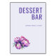 Ce panneau de table de mariage présente un design minimaliste avec un fond lavande clair, créant une atmosphère invitante. Le texte gras et violet foncé indique "DESSERT BAR", tandis que la ligne plus petite et de couleur violet plus clair en dessous dit "please take a treat !" dans une police sans-serif propre. Une illustration réaliste mais stylisée de fleurs de protea ajoute une touche d'élégance au coin inférieur gauche. La palette de couleurs harmonieuse et la composition équilibrée transmettent une humeur joyeuse et accueillante, parfaite pour améliorer votre station de desserts lors de toute célébration.