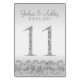 Ce design moderne de carte de table présente des accents de parties scintillant en argent faux avec un arrière - plan en argent. Parfait pour les mariages élégants et modernes. Les cartes de numéro de table vont jusqu'à 50.