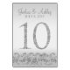 Ce design moderne de carte de table présente des accents de parties scintillant en argent faux avec un arrière - plan en argent. Parfait pour les mariages élégants et modernes. Les cartes de numéro de table vont jusqu'à 50.
