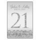 Ce design moderne de carte de table présente des accents de parties scintillant en argent faux avec un arrière - plan en argent. Parfait pour les mariages élégants et modernes. Les cartes de numéro de table vont jusqu'à 50.
