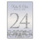 Ce design moderne de carte de table présente des accents de parties scintillant en faux argent avec un arrière - plan périwinkle. Parfait pour les mariages élégants et modernes. Les cartes de numéro de table vont jusqu'à 30.