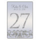 Ce design moderne de carte de table présente des accents de parties scintillant en faux argent avec un arrière - plan périwinkle. Parfait pour les mariages élégants et modernes. Les cartes de numéro de table vont jusqu'à 30.