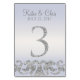Ce design moderne de carte de table présente des accents de parties scintillant en faux argent avec un arrière - plan périwinkle. Parfait pour les mariages élégants et modernes. Les cartes de numéro de table vont jusqu'à 30.