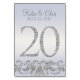 Ce design moderne de carte de table présente des accents de parties scintillant en faux argent avec un arrière - plan périwinkle. Parfait pour les mariages élégants et modernes. Les cartes de numéro de table vont jusqu'à 30.