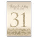 Cette carte de table moderne présente des accents de parties scintillant en faux or avec un arrière - plan de champagne. Parfait pour les mariages élégants et modernes. Les cartes de numéro de table vont jusqu'à 50.