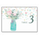 Une jarre de mason bleu blanc géant contient des fleurs rose pâle et blanches avec une douce verdure turquoise sur cette carte de numéro de table mariage. Un arrière - plan de confettis rose pastel et bleu se marie avec des éclats d'or pour ajouter de l'intérêt et contraster avec les fleurs délicates. Votre texte personnalisé est turquoise. L'arrière de la carte est identique à l'avant. Assurez-vous de voir les invitations de mariage correspondantes dans notre magasin. *Cette conception utilise des oeuvres de LABFcreations sur Etsy.
