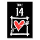 Carte de numéro de table amour cœur noir et rouge qui est parfaite pour un mariage sur le thème de la moto.