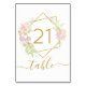 Numéro de table avec des fleurs délicates d'aquarelle et des accents dorés.