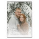 Cette carte de table de mariage présente un thème hivernal cosy avec une photographie de deux personnes debout l'une près de l'autre dans une forêt enneigée, entourées d'arbres persistants couverts de neige. Le design utilise une palette de couleurs froides de blancs et de gris contrastés avec des tons chauds provenant des vêtements des sujets, créant une atmosphère intime et sereine. Une typographie cursive élégante met en valeur "table 12", tandis qu'un texte sans-serif simple fournit de la clarté pour les noms, ce qui le rend parfait pour personnaliser votre événement de mariage. Le style de représentation réaliste capture la beauté d'un paysage hivernal, idéal pour ajouter une touche de nature à votre célébration.