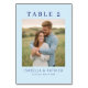Cette carte de table de mariage présente un paysage naturel serein avec deux personnes s'étreignant, sur un fond flou de collines ondoyantes et de champs herbeux. Le design est encadré par une bordure bleu clair, créant une atmosphère apaisante, tandis que la typographie utilise des polices serif grasses en bleu marine profond pour un toucher élégant. Le texte personnalisable permet une personnalisation avec les noms et les dates, ce qui en fait un élément idéal pour ajouter une touche personnelle à votre jour spécial. L'ambiance générale est chaleureuse et accueillante, idéale pour célébrer l'amour et la connexion lors d'événements formels ou de jalons importants.
