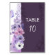 An elegant purple floral wedding table number card featuring soft watercolor flowers in lavender, blush, and white, accented with delicate botanical line art and a graceful butterfly. The vertical layout with a deep plum panel creates a romantic and sophisticated look, perfect for guiding guests to their reception tables while coordinating beautifully with your floral wedding stationery and décor suite.