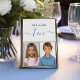 Une façon moderne et plus originale de personnaliser vos numéros de table avec des photos d'enfance de mariée et mariée à l'âge de ce nombre (la valeur par défaut est dix). Les photos d'une petite fille (la mariée) et d'un petit garçon (le marié) sont dans des cadres noirs, dans la moitié inférieure. Dans la partie supérieure, il y a le message "quand nous avions dix ans" avec l'âge écrit dans un script d'écriture bleue et le reste ci-dessus, en casquette noir plus petit (lettres). Les photos de deux enfants, un garçon et une fille, qui sont des photos de l'espace réservé, ne sont pas réelles, elles sont générées par l'IA.