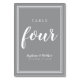 Ce design a été créé pour des célébrations mariages intimes plus petites. Simple, minimaliste et élégant Mariage Numéro de table FOUR design contemporain avec une bordure à double cadre en blanc immaculé sur un arrière - plan gris ultime sophistiqué. Le design chic offre une sophistication intemporelle et moderne. Personnalisez la conception de table mariage avec vos détails mariages en lettres et en script blancs. Le dos de la carte est un double de l'avant. Commandez-en une pour chaque table avec les numéros de table individuels. Les tables ONE à TEN sont conçues individuellement et sont disponibles dans notre magasin InvitationSuites sur Zazzle. Bien qu'il soit spécialement conçu pour un lieu plus petit, si vous avez besoin de numéros supplémentaires, envoyez-nous un courriel à InvitationSuites@gmail.com .