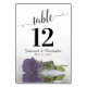 Ces belles cartes de numéro de table faciliteront la recherche de sièges à votre réception de mariage. Dispose d'un design magnifique avec la calligraphie en dentelle et un rose unique lavande, lilas ou pourpre poussiéreux, allongé sur son côté avec des vagues ondulées et des reflets. Il y a de la place pour les noms du couple et la date du mariage.