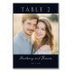 This wedding table card features a portrait-oriented layout with a central photograph of two individuals, framed by elegant text elements. The design uses a warm color palette of golden yellow and soft blue, creating a serene and romantic atmosphere. At the top, "TABLE 2" is displayed in large, uppercase serif letters against a deep navy banner, while the bottom includes script-style typography for customizable names and dates, adding a personalized touch. The overall style blends modern photography with traditional calligraphy, conveying warmth, intimacy, and celebration, perfect for weddings or formal gatherings.
