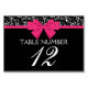 Cette carte de numéro de tableau présente un élégant motif rose noir et blanc, un arc rose chaud et du texte blanc sur un arrière - plan noir. Il est imprimé de chaque côté.