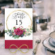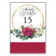 Carte Numéro de tableau avec calligraphie élégante, rose rouge et fleurs, feuilles d'eucalyptus et verdure. L'agencement floral est placé dans un cadre de cercle géométrique doré. Vous trouverez des invitations coordonnées, des articles de papeterie et des décors de jour dans ma collection Rose et Eucalyptus Quinceanera ou, vous pouvez m'envoyer un message pour ajouter les modèles de design dont vous avez besoin.