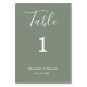 Arrière - plan moderne vert sauge avec script blanc avec le mot "table" écrit dans elle apparaît sur les cartes de numéro de table mariage à la mode. Un arrière - plan taupe ou toute couleur de votre choix est utilisé dans la conception. Le motif est répété à l'arrière. Indiquez votre nom, votre date de mariage et votre numéro de table lors de la commande des cartes de table. Ajoutez individuellement chaque numéro à votre panier, puis passez à la caisse une fois terminée.