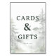 This wedding tabletop sign features a serene, nature-inspired design with a soft green and white color palette. The layout includes stylized pine trees in watercolor-like strokes, creating an ethereal forest scene. Prominently displayed text reads "CARDS & GIFTS" in bold serif font, followed by "thank you" in a smaller sans-serif style, conveying gratitude. The minimalist aesthetic emphasizes tranquility and simplicity, making it perfect for expressing appreciation at your special event.