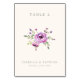 This elegant wedding table card features a minimalist layout with a soft, off-white background. The design showcases a delicate watercolor-style floral illustration in shades of pink and purple, creating a serene and romantic atmosphere. Clean sans-serif typography at the top indicates the table number, while the bottom section includes customizable names and date in a simple serif font, adding a touch of sophistication. Perfect for weddings, this card combines gentle colors and refined elements to set an inviting tone for your special day.