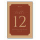 This elegant wedding table card features a warm, earthy color palette with deep rust brown and soft beige tones. The design showcases a sophisticated layout centered around the number "12" in large serif typography, complemented by flowing script for the word "table." The initials at the top are set in a clean sans-serif font, adding contrast to the ornate elements below. With its vintage charm and modern minimalism, this card exudes timeless sophistication, perfect for formal occasions.