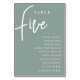 Des cartes numériques simples et chic dans Eucalyptus Green et white font une déclaration élégante à votre mariage ou événement. Le design comporte "table [nombre]" dans un mélange d'écriture serif classique et manuscrite, avec des noms d'invités individuels en dessous. Le design se répète de part et d'autre. Cartes numérotées individuellement vendues séparément; commandez chaque numéro de table individuellement de notre collection.