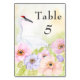 This table number sign features a hand-painted watercolor of a graceful whooping crane surrounded by soft pink, violet, and peach anemones. Symbolizing devotion and new beginnings, the romantic botanical artwork adds a refined and cohesive touch to the celebration.