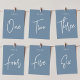 Des cartes numériques simples et chic en bleu Dusty et blanc font une déclaration élégante à votre mariage ou événement. Le design comporte "table [nombre]" dans un mélange de sérigraphie classique et de lettres manuscrites. Le design se répète de part et d'autre. Cartes numérotées individuellement vendues séparément; commandez chaque numéro de table individuellement de notre collection.