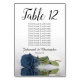 Ces cartes de numéro de table vous permettront de trouver facilement votre place à la réception de votre mariage. Elles présentent un design simple mais élégant avec une calligraphie en dentelle et un seul rose bleu acier poussiéreux posé sur son côté avec des vagues ondulées et des reflets. La carte comprend un tableau de sièges avec 10 noms. Il y a aussi de la place pour les noms du couple et la date du mariage.