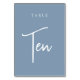 Des cartes numériques simples et chic en bleu Dusty et blanc font une déclaration élégante à votre mariage ou événement. Le design comporte "table [nombre]" dans un mélange de sérigraphie classique et de lettres manuscrites. Le design se répète de part et d'autre. Cartes numérotées individuellement vendues séparément; commandez chaque numéro de table individuellement de notre collection.