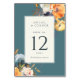 Éléments : florales audacieuses sur fond sarcelle. Vos noms et détails sont encadrés dans un ton crème classique. Couleurs : sarcelle, vert, marine, crème, terre cuite, orange, or, bleu poussiéreux. Thèmes : neutres frais, classique, contemporain, boho, bohème, botanique, jardin. Collection : Collection de mariage floral boho élégant sarcelle terre cuite marine. Type de produit : carte de table