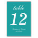 Numéro de table mariage simple pour une couleur mariage turquoise. C'est juste du texte blanc sur un arrière - plan bleu turquoise. Tout sauf le numéro lui-même est écrit dans un élégant script calligraphique.