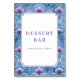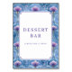This is a vintage style image featuring an elegant dessert bar invitation. The background showcases intricate floral patterns in soothing shades of blue and purple, creating a luxurious and inviting atmosphere. At the center, a clean white rectangle with bold purple text announces "DESSERT BAR" followed by a charming prompt, "PLEASE TAKE A TREAT!" It exudes sophistication and warmth, perfect for adding a touch of class to any celebration or event.
