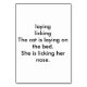 Ces flashcards personnalisées comportent les verbes en train de pondre et de lécher. La photo est un chat allongé sur un lit, pendant qu'elle lèche son nez. Le texte sur le dos dit, "lécher le chat est allongé sur le lit. Elle se lèche le nez." Le texte peut être customisé. Merci pour l'achat CustomFlashCards sur Zazzle pour la lecture de cartes mémoires pour adultes. J'étais un tuteur en alphabétisation pour adultes, et ces types de cartes flash auraient été très utiles.