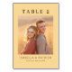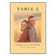 This wedding table card features a clean, modern design with a warm beige background and black serif typography. The layout is balanced, with the central photo placeholder framed by bold "TABLE 2" text at the top and elegant names below, creating an inviting atmosphere. Its minimalist aesthetic emphasizes simplicity and warmth, making it perfect for a formal gathering or wedding celebration. The customizable elements allow for personalization while maintaining a sophisticated look that complements any event setting.