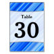 Ce design de carte de table est composé d'un motif de rayures ou de lignes colorées de différentes nuances de bleu. Il dispose également d'un numéro de table personnalisé en gras près du centre, dans une zone de couleur plus claire qui a des bordures courbes. Ces cartes peuvent être utilisées sur les tables d'une réception de mariage, d'une fête de vacances, d'une fête d'anniversaire, d'une conférence ou d'un autre événement avec des tables et des sièges.